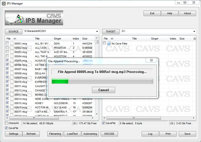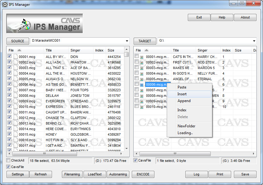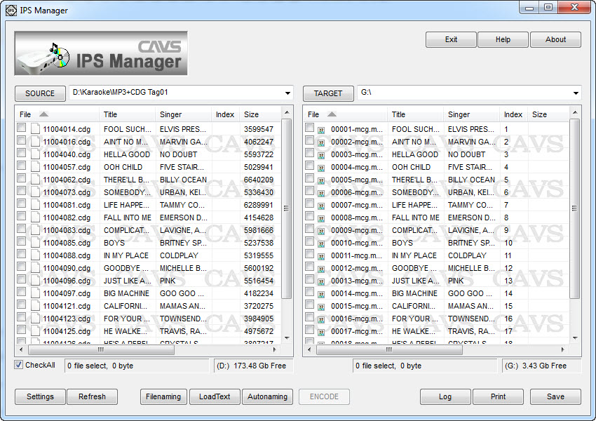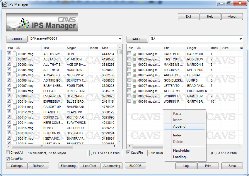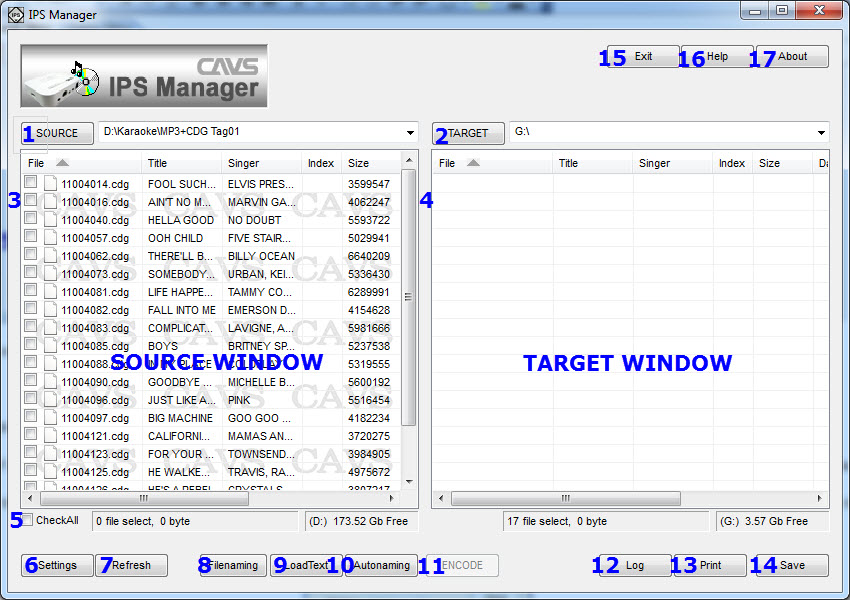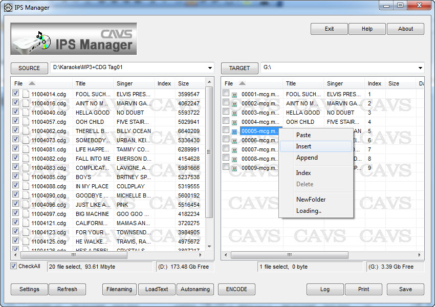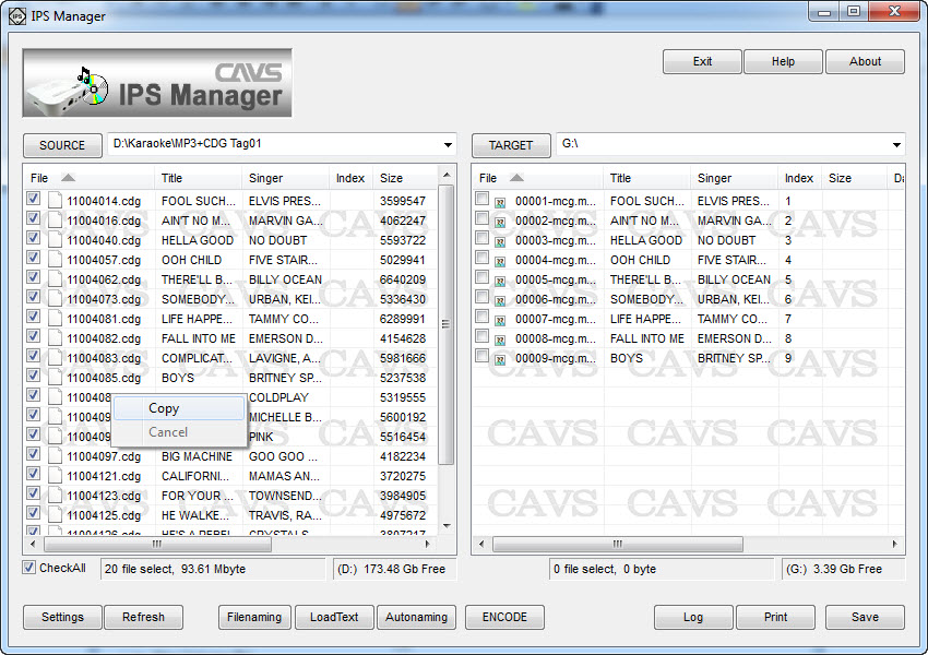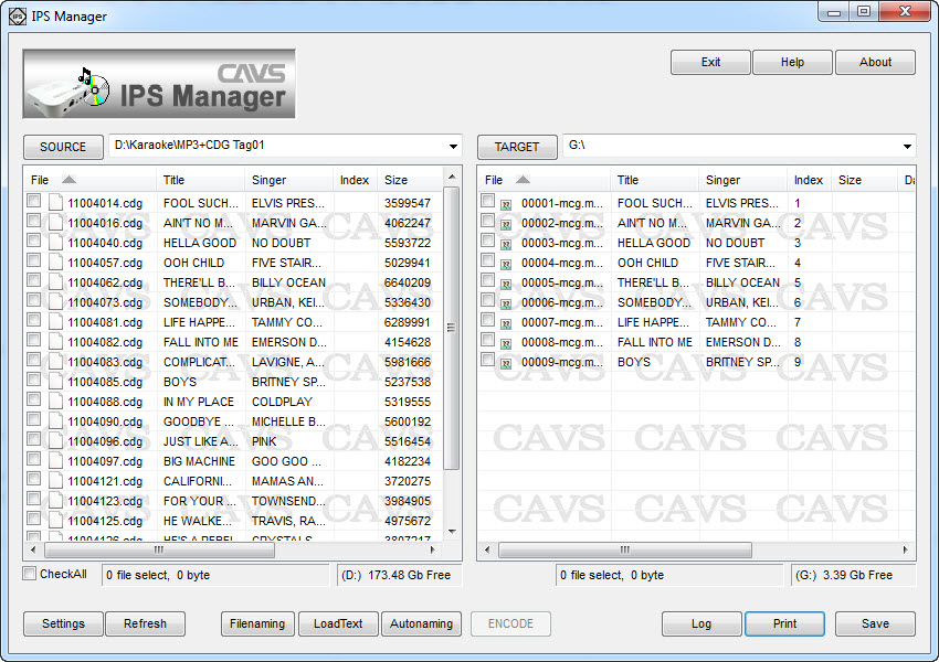 Here we show how to convert and transfer the song files of CDG+MP3, MP3+G, MCG+MP3, and NCG+MP3 formats which may come from CAVS DVD USB (105G USB, 203G USB, 305G USB), JB-199 (I, II) or PlayCDG KJ Deluxe 64 LT (CAVS Karaoke Laptop, Touch Screen, All-In-One) players into the USB memory device using the IPS Manager program for play in IPS-11G player.