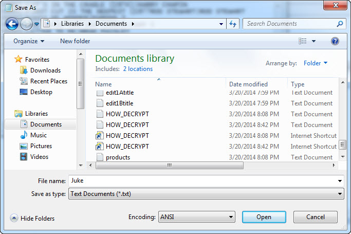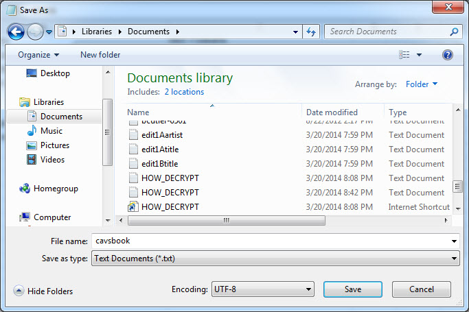 Libraries\Documents. Be sure to save the file as the UTF-8 encoding as shown