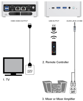 Use an RCA R/L cable to connect the audio output of the karaoke player to the audio input (AUX1 or AUX2) of the karaoke mixer.