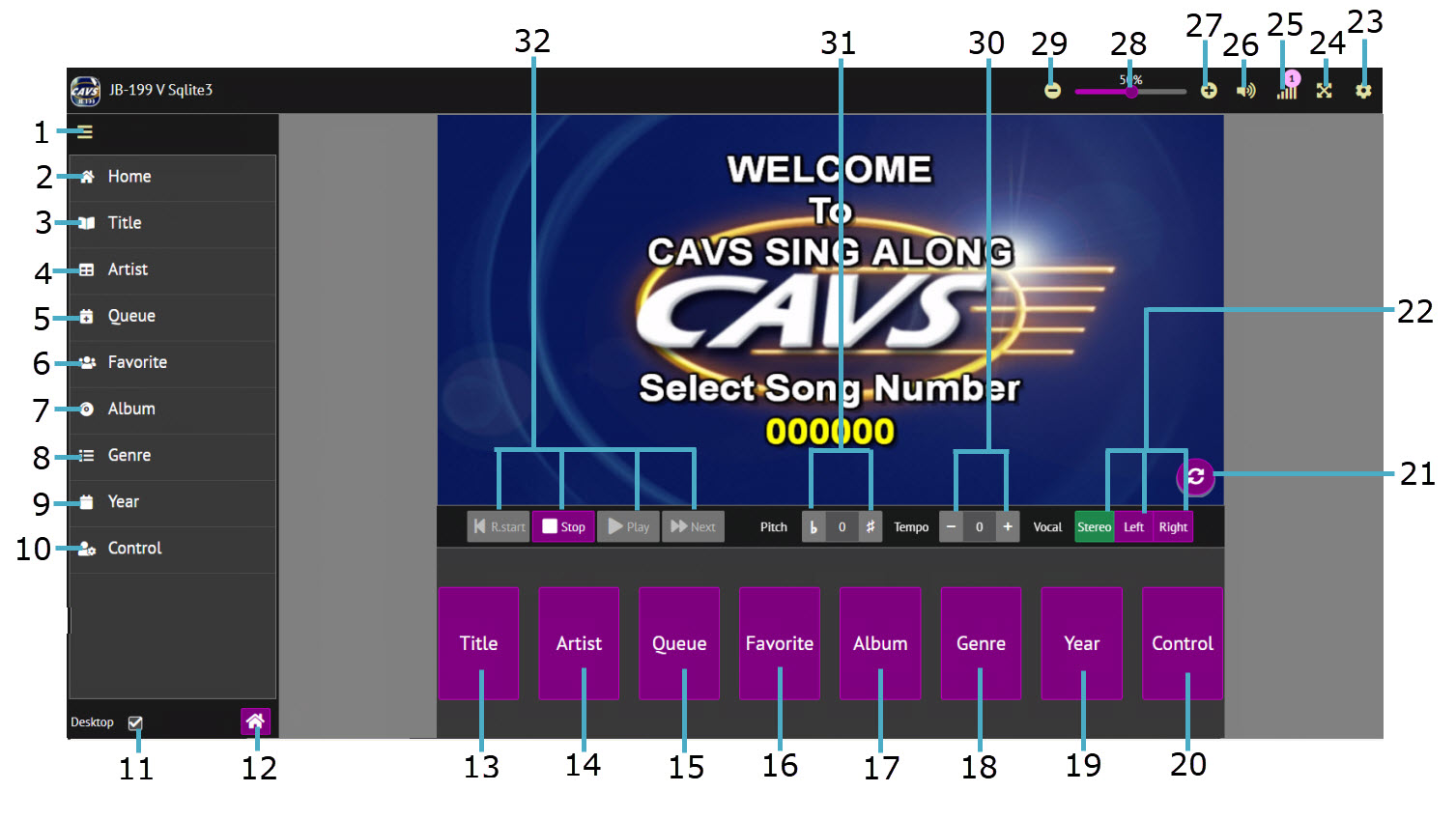 The Customer Interface is the screen that appears when a customer is using a phone or tablet to connect to the JB-199 V karaoke player. This screen can also be emulated locally by the JB-199 V karaoke player by enabling the Local Customer Interface in the Setting. The screen may vary in color or proportion depending on the device used.