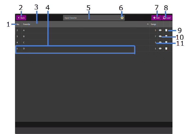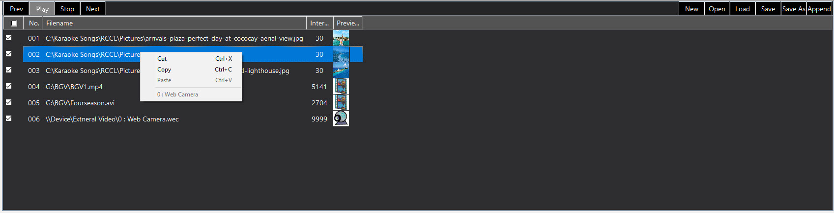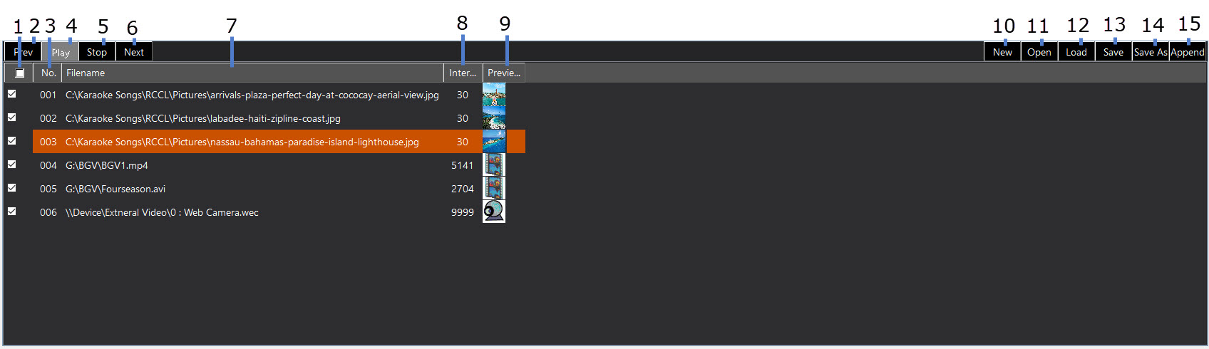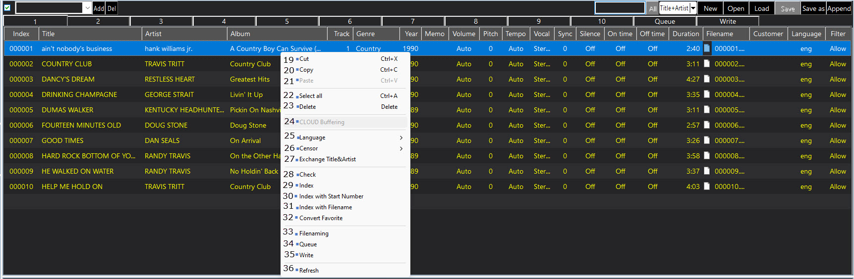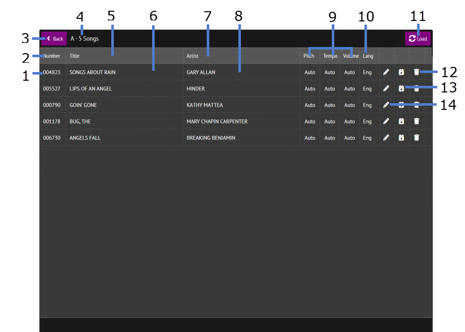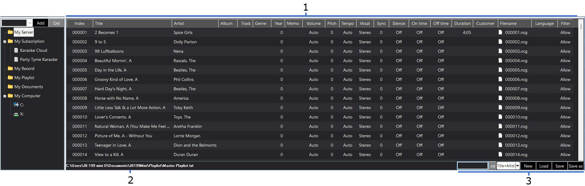 Loading songs of foreign language follows the same steps as in 7.1 How to load and play karaoke songs. The difference is that the playlist will be in foreign fonts instead. In this example, the songs of following foreign languages are loaded and made into playlists.