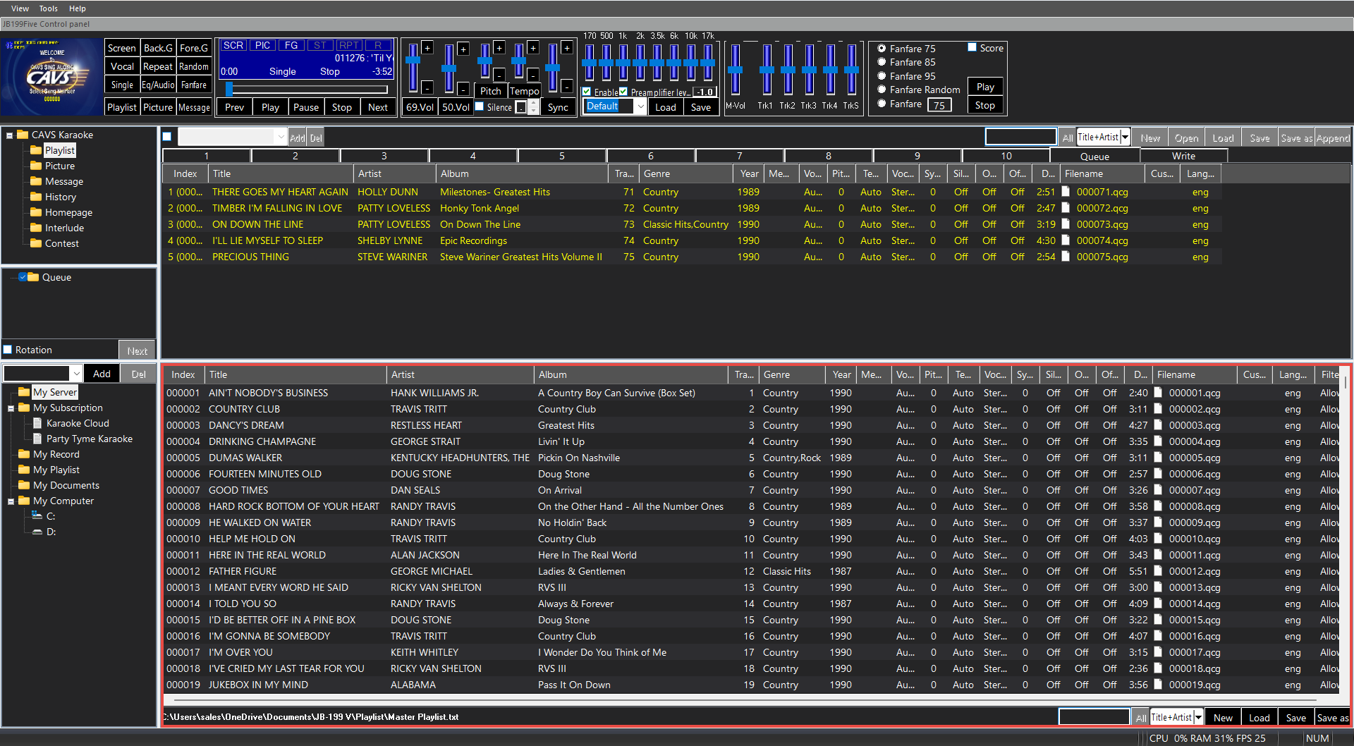 The playlists Spanish, Chinese, Japanese, Russian, and French are appended to the Master Playlist which contains the English songs as shown in 7.1 How to load and play karaoke songs. Follow the instruction at 7.1.4.3 Editing playlist to append the playlists.