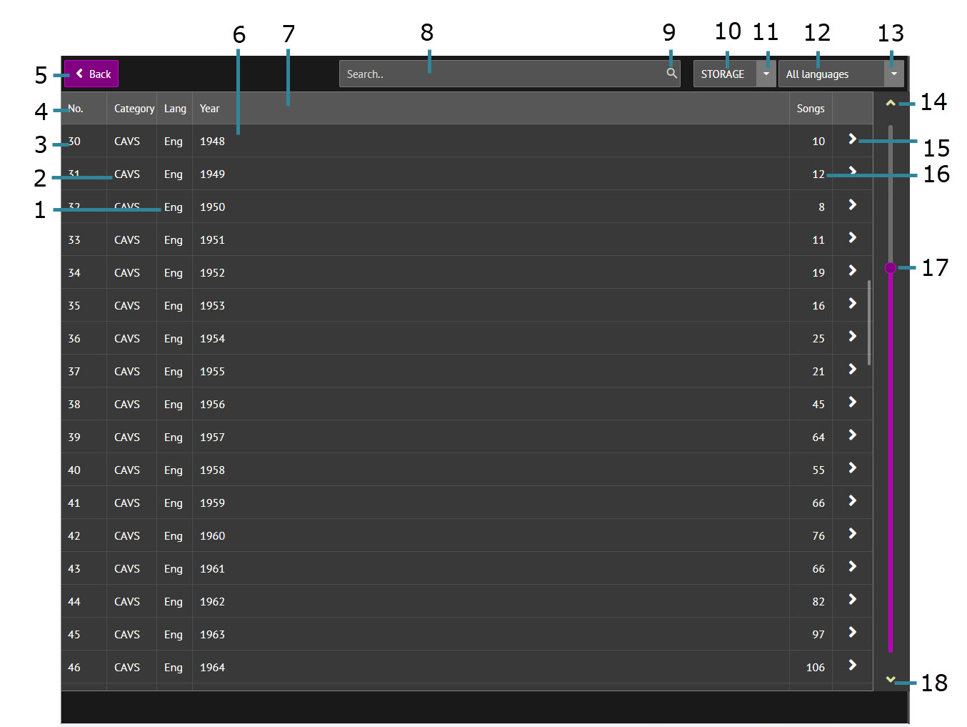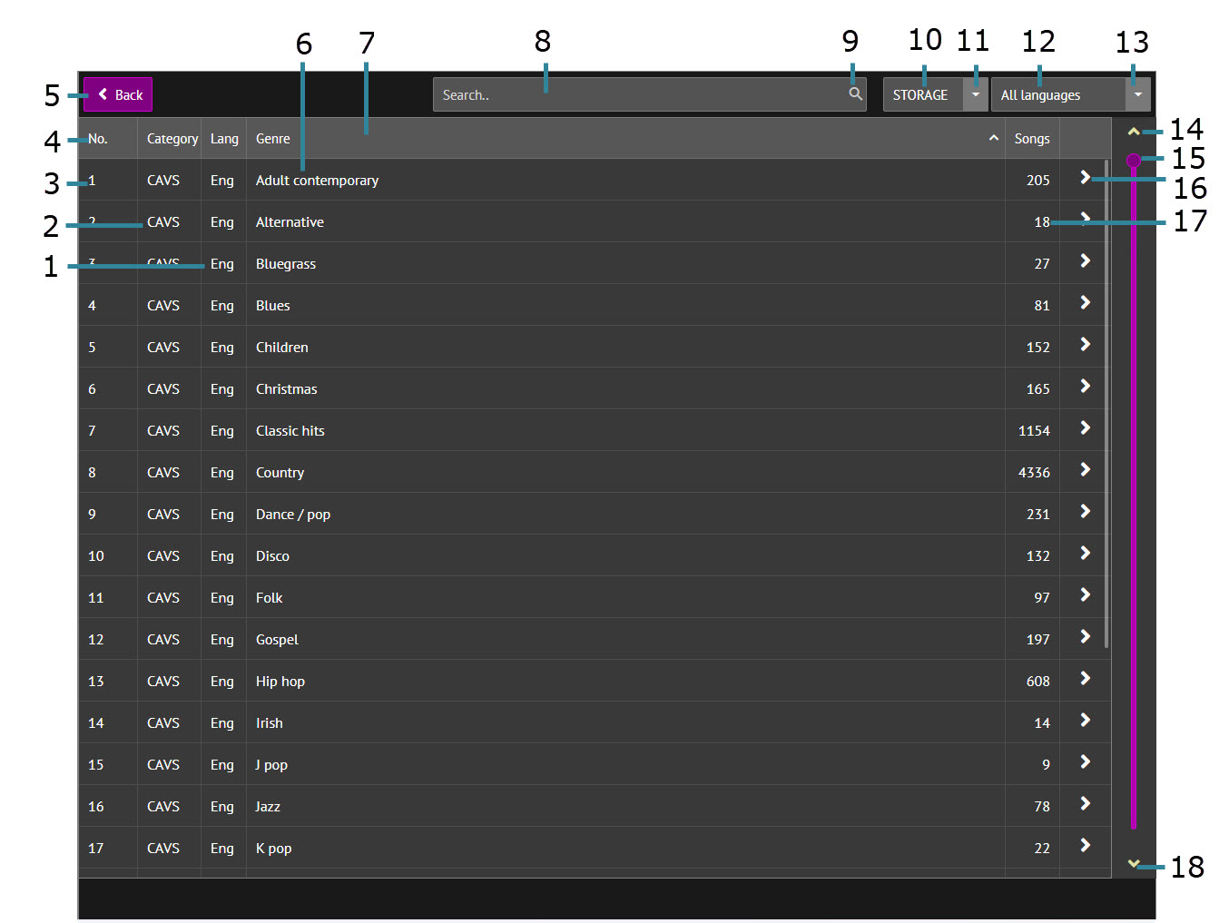 A list of languages available in the songs appears. Select a language to display only the songs of the selected language. Or select All languages to display all songs. In this example, Chinese is selected.