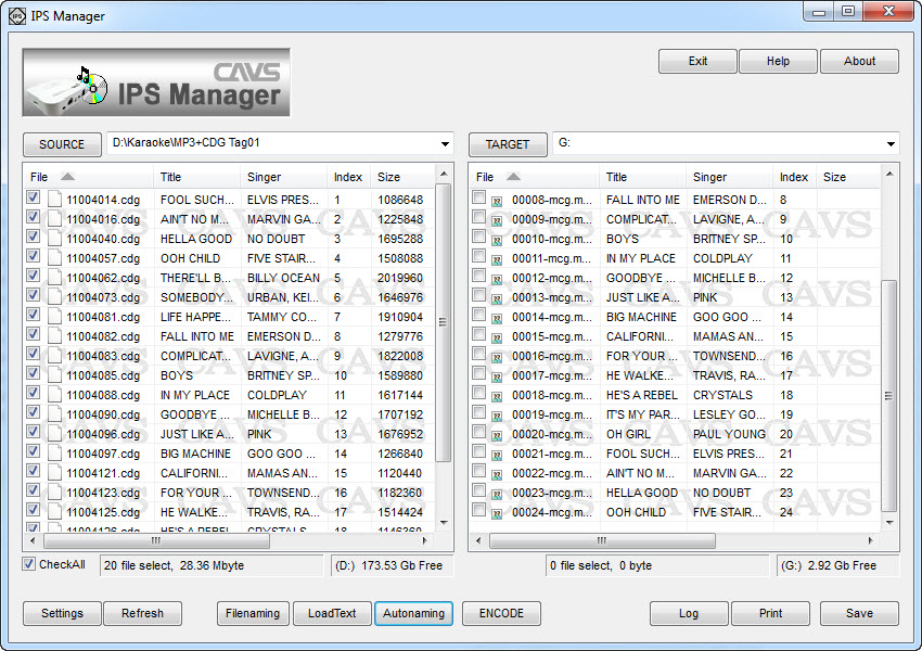 3. Press TARGET(4) and select the folder with existing song files (such as C:\Karaoke). The folder will show the existing MP3 + MCG files along with Juke.txt, English.txt, and Scdg.cfg files. You can check the CavsFile button on the TARGET side to simplify the listing on the TARGET window.